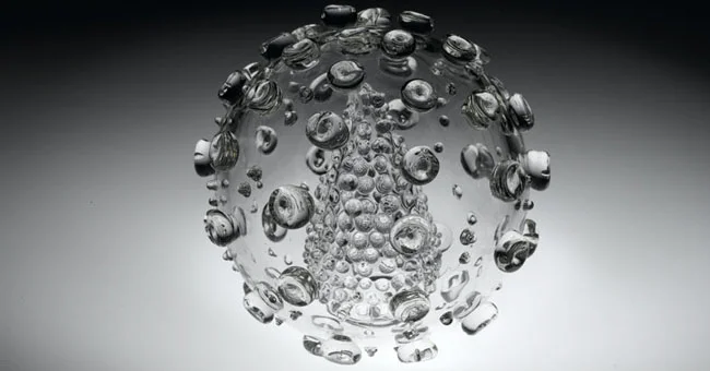 This representation of HIV is a complex three-dimensional transparent form. The sculpture was designed using a combination of different scientific photographs and models and made in collaboration with glassblower Kim George.